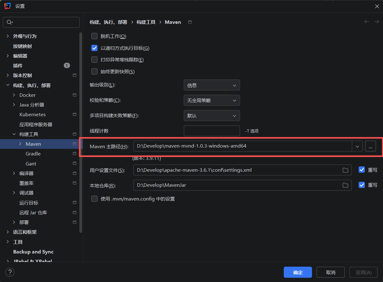 为了避免重新配置镜像和仓库,直接让 mvnd 使用你原有的 Maven settings.xml。