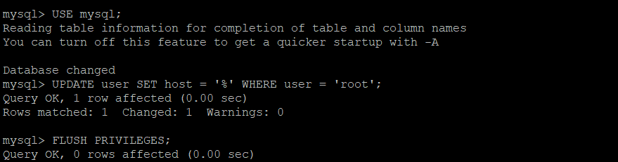 UPDATE user SET host = '%' WHERE user = 'root';